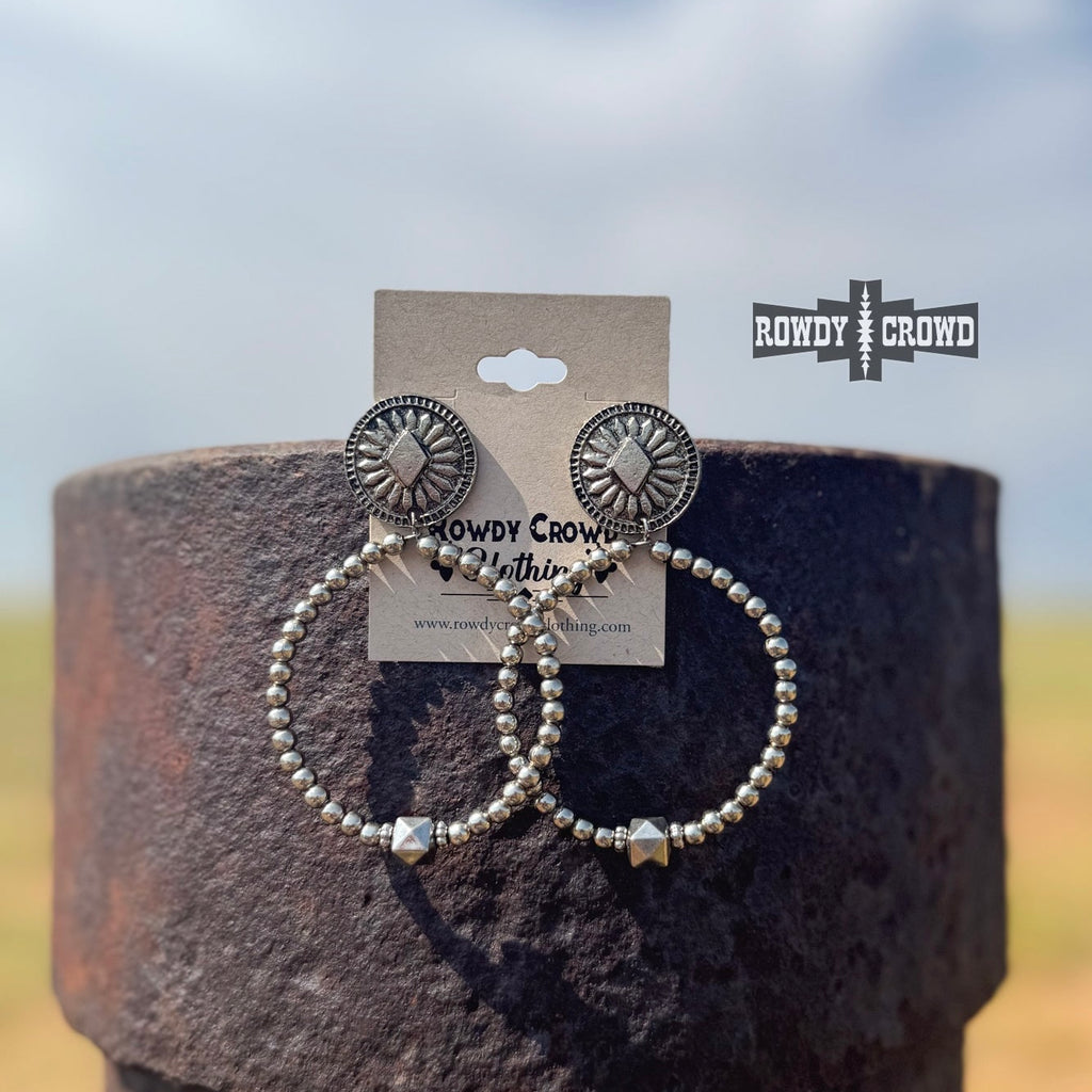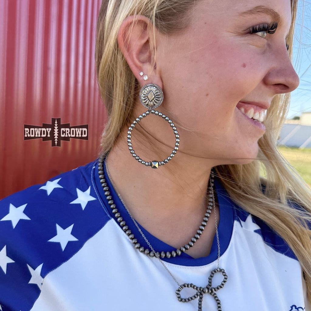 Ride into timeless Western style with these stunning High Horse Hoops featuring classic silver concho studs and dangling beaded hoops, complete with a bold center bead. Perfect for festivals, rodeos, or everyday wear. Length 3"