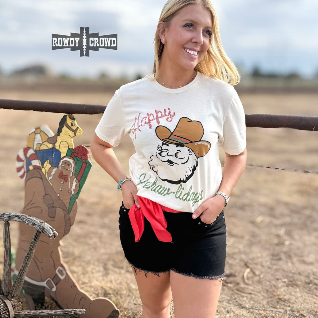 Santa’s gone western! The Yeehaw-lidays Tee brings festive cheer with a cowboy twist-featuring a jolly Santa in a hat and rope-style lettering. Soft, fun, and full of western holiday spirit. 52% Cotton/48% Polyester.
