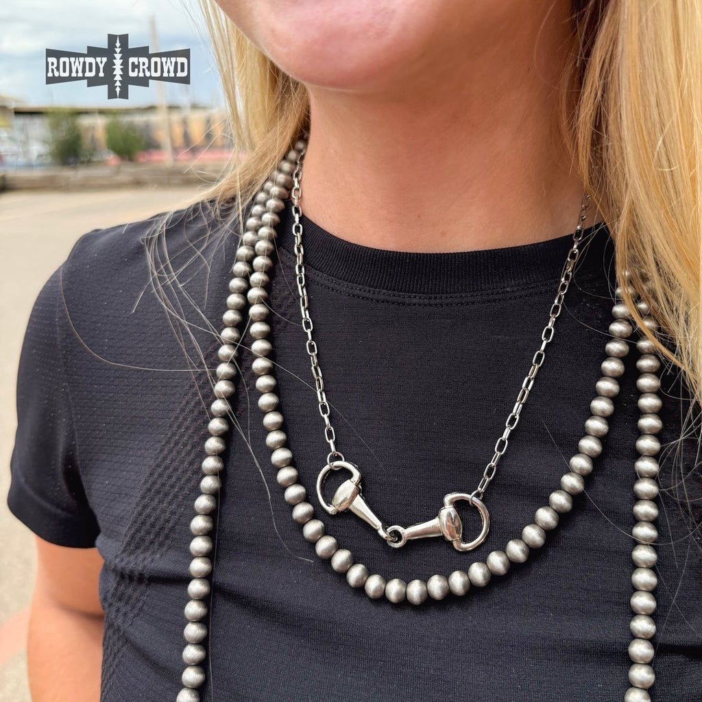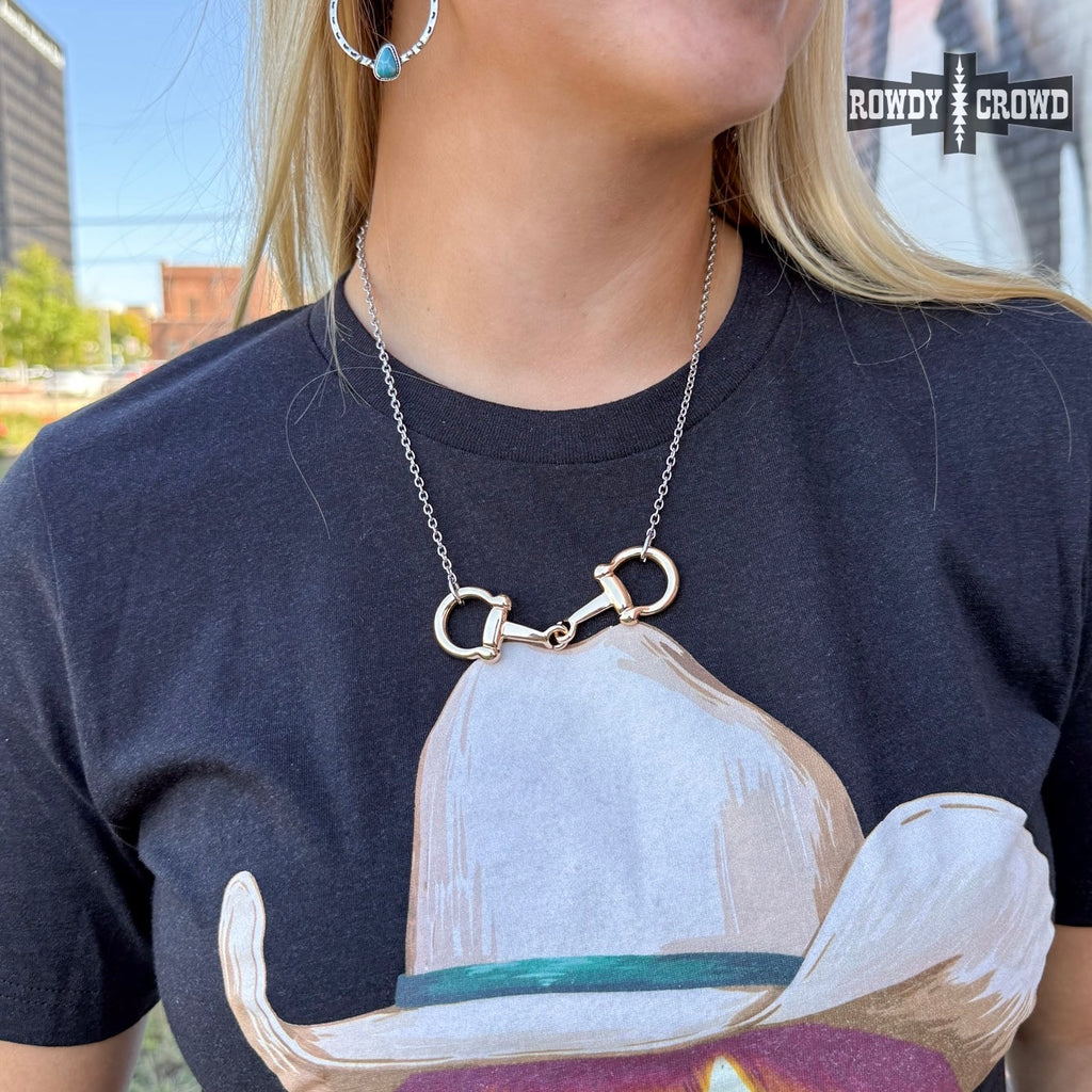Hey Cowboy - A stylish and lightweight snaffle bit necklace. Lightweight with a gauge chain, this is a simple layering option or great for those who prefer dainty. 100% Metal. 23“ long from lobster claw clasp to adjustable chain with a 3“ snaffle bit in the center.