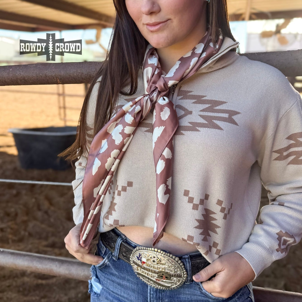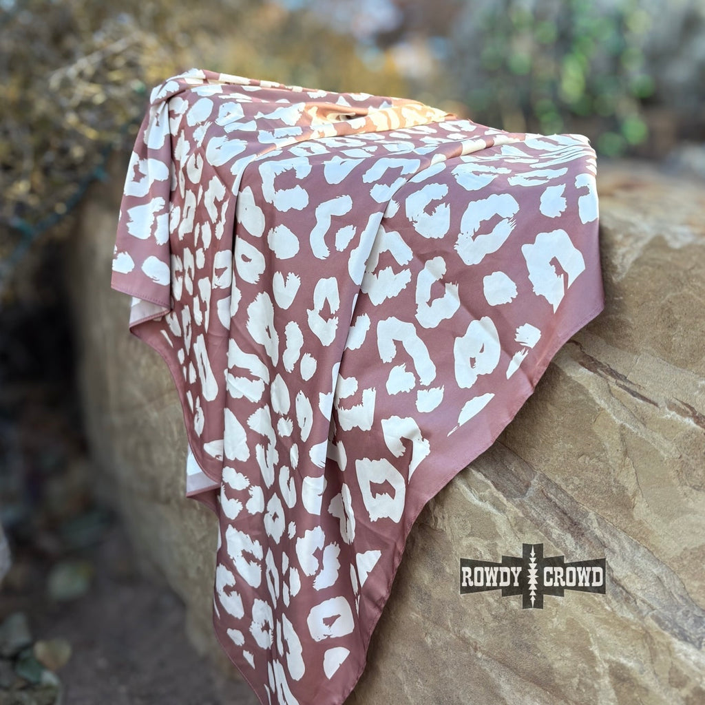 The Mocha Leopard Wild Rag blends soft, earthy tones with a bold, chic print. Its silky mocha base is patterned with oversized cream leopard spots, giving it a chic western edge that pairs perfectly with denim, knits, and turquoise. Lightweight with a smooth, luxurious drape, it’s easy to tie, wrap, or style however you like. 36"x36". 100% Polyester